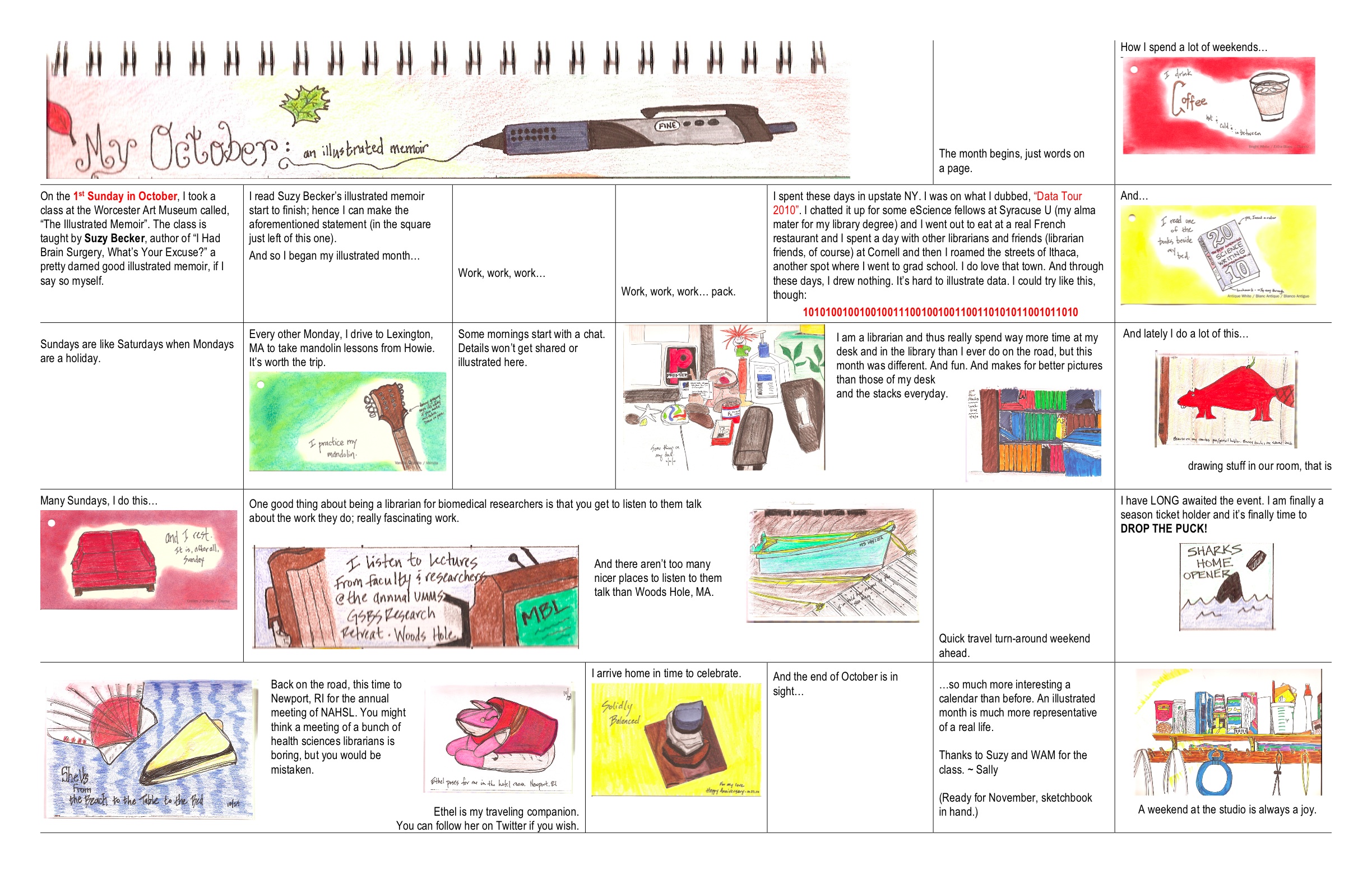 I put the finishing touches (well, the finishing touches until I print it and see what needs fixing) on my “October”, an illustrated memoir I worked on last month after taking Suzy Becker’s class on the subject at the Worcester Art Museum. It is not the project that I left the class hoping to start (as my self-addressed, self-written reminder postcard from the class reminded me when it arrived this week), but it’s a start that I’m happy with. I’ll get up to speed on the other project soon enough.
