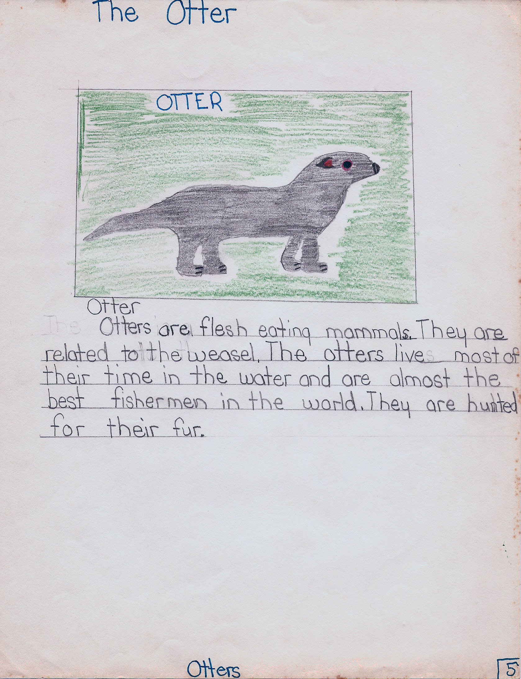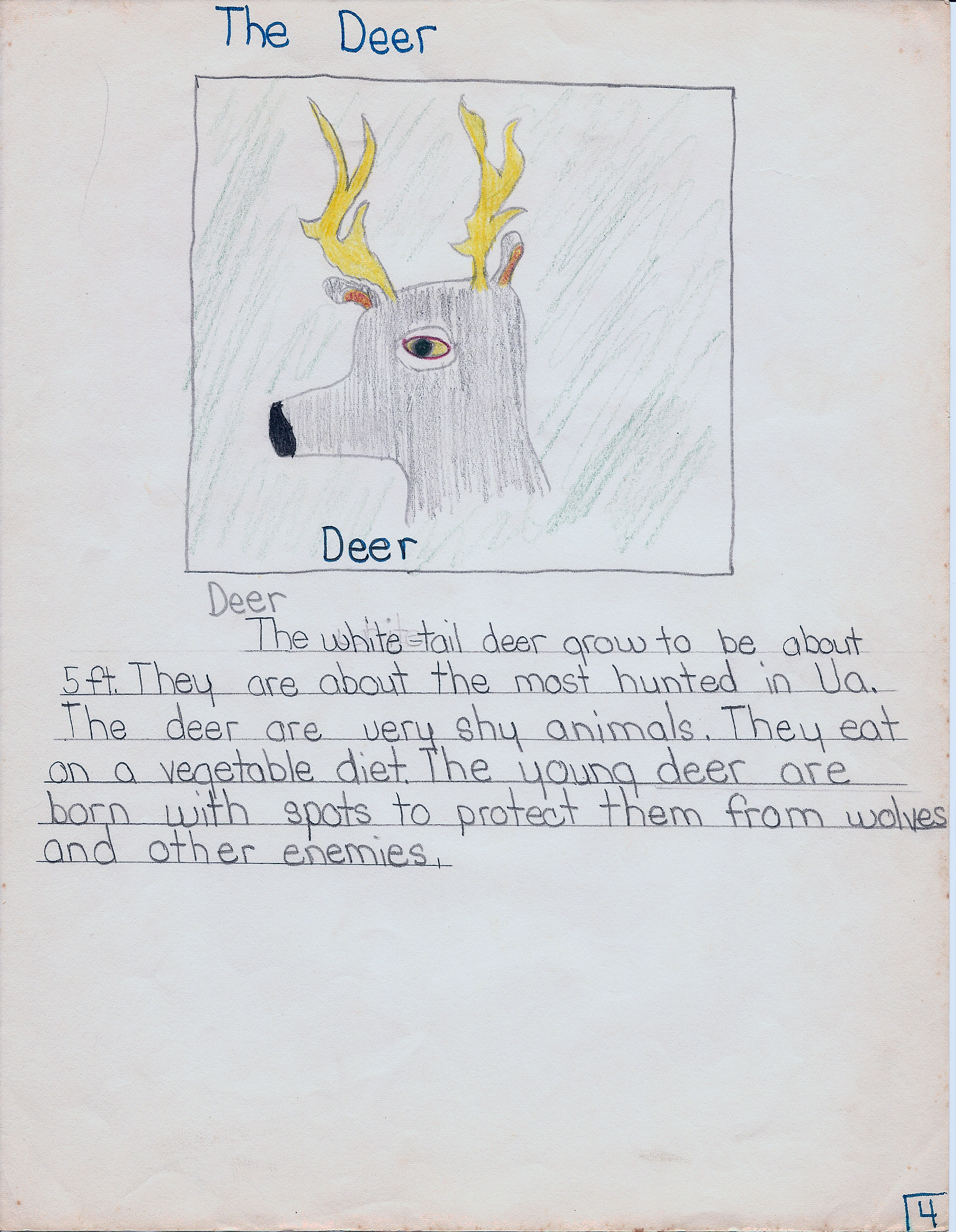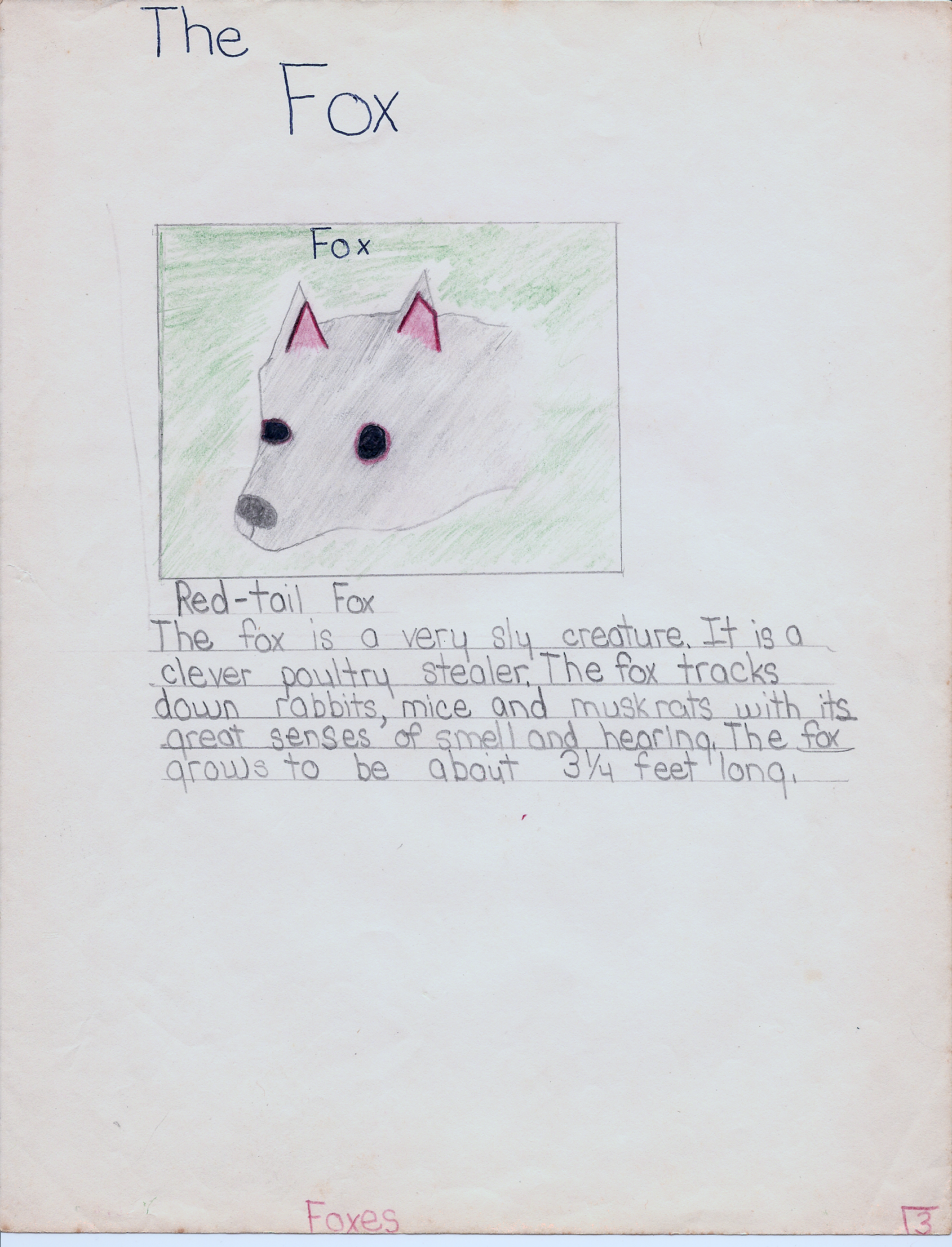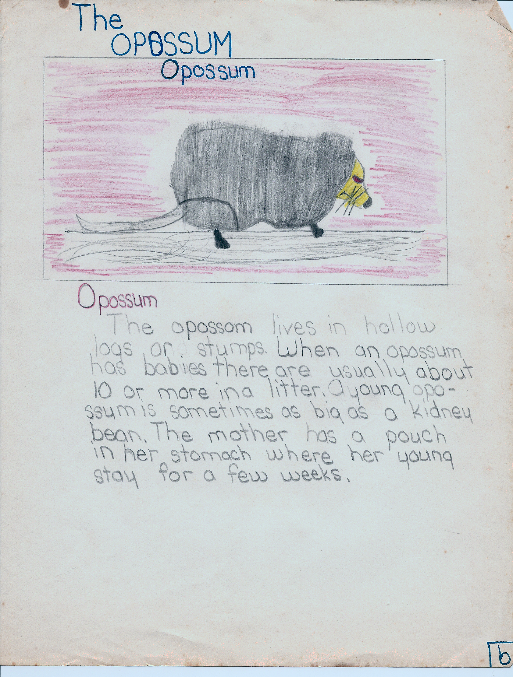The topic of marsupials came up today amongst friends and I recalled a book I’d put together as an assignment when I was in the 4th grade. That’s the grade, you know, when you learn all about your state. I lived in Virginia and this report was about the animals that are… hunted… there. Sigh. I’m sure there was a political statement being made on my part.