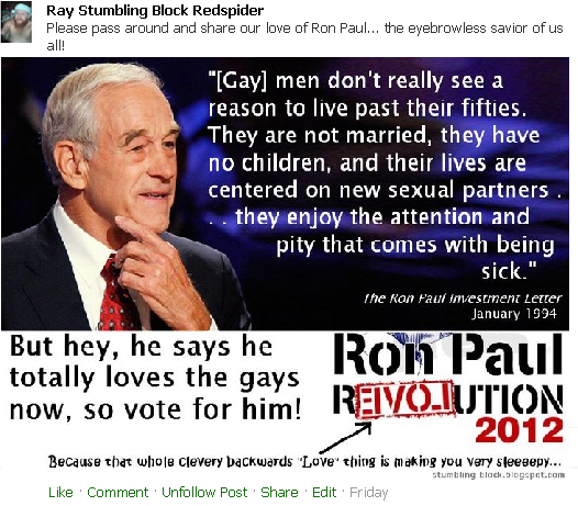 Mitt Romney (god help us) has been labeled a flip-flopper for what seems like the past decade. It’s the reason no one is to trust him – because he changes his mind. Same is being said of Ron Paul in this ad (or whatever you call these things). He once said and/or held some totally ludicrous ideas about gay men. Completely unfounded, hateful and inane. Today, he says he holds different thoughts. By this picture though, I’m not supposed to believe that such a change is possible OR, and this is the part that bothers me so much, that if it is possible and he does feel differently, this is a bad thing.