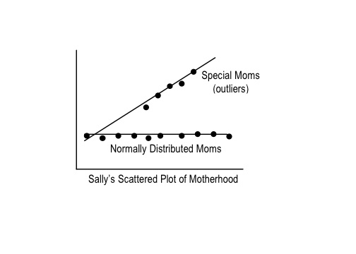 I make a motion with my hand, drawing a straight, horizontal line in the air like an x-axis. I also can’t help but think at the same time that she herself is a mother. I wonder where she falls on my graph of motherhood.